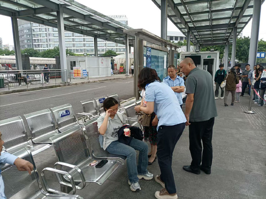 5月17日下午16:55分,雙鳳橋站務(wù)人員楊平發(fā)現(xiàn)候車椅上的一名學(xué)生臉色蒼白雙目緊閉,緩緩靠向椅邊,意識(shí)到情況異常立即前去詢問(wèn)該學(xué)生的身體狀況,隨后兩位路隊(duì)長(zhǎng)也趕到。因?yàn)椴涣私獠∫?,只能通過(guò)捏手臂、掐人中等最簡(jiǎn)單的急救方法,確保身體血液的循環(huán)、流通,并送上溫開水、糖、藿香正氣液等物品進(jìn)行救助。不一會(huì)兒,這名學(xué)生慢慢恢復(fù)了意識(shí)。路隊(duì)一邊安撫情緒,一邊詢問(wèn)其家長(zhǎng)的聯(lián)系方式。當(dāng)學(xué)生母親趕到樞紐站時(shí),看到安然無(wú)恙的小劉,她難掩激動(dòng),對(duì)兩位路隊(duì)長(zhǎng)以及站務(wù)人員的熱心幫助表達(dá)了誠(chéng)摯感謝。