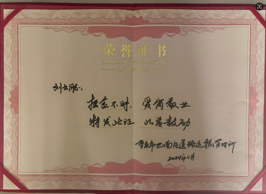 公交駕駛員拾金不昧 巴南運管所頒發(fā)榮譽證書