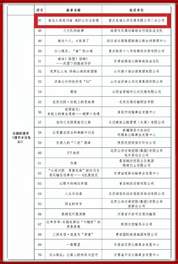 自活動(dòng)啟動(dòng)以來(lái),公司領(lǐng)導(dǎo)高度重視,龍盛經(jīng)營(yíng)部積極響應(yīng),在市交通運(yùn)輸委、市道路運(yùn)輸事務(wù)中心、渝北區(qū)交通運(yùn)輸委、渝北區(qū)道路運(yùn)輸事務(wù)中心和物流集團(tuán)的關(guān)心、幫助與支持下,經(jīng)組委會(huì)材料初篩、活動(dòng)初選,東城公交川渝20路好故事《南北大道連川渝 城際公交話親情》成功入選百?gòu)?qiáng)好故事,使東城公交在成渝雙城經(jīng)濟(jì)圈建設(shè)中的積極作為得到了有效展示。
