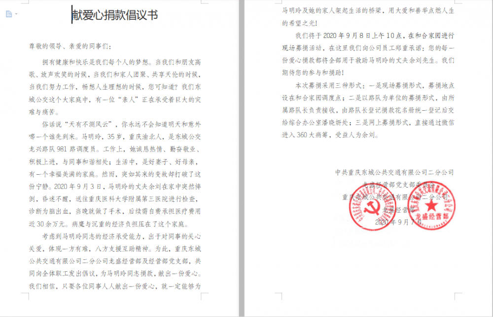 馬明玲是重慶東城公交公司龍盛經(jīng)營部龍興路隊981路一名普通的調(diào)度員。當?shù)弥恼煞蛴鄤⑼话l(fā)腦溢血,后續(xù)醫(yī)療費用困難,龍盛經(jīng)營部立即發(fā)起了為員工患病家屬捐款的獻愛心活動。