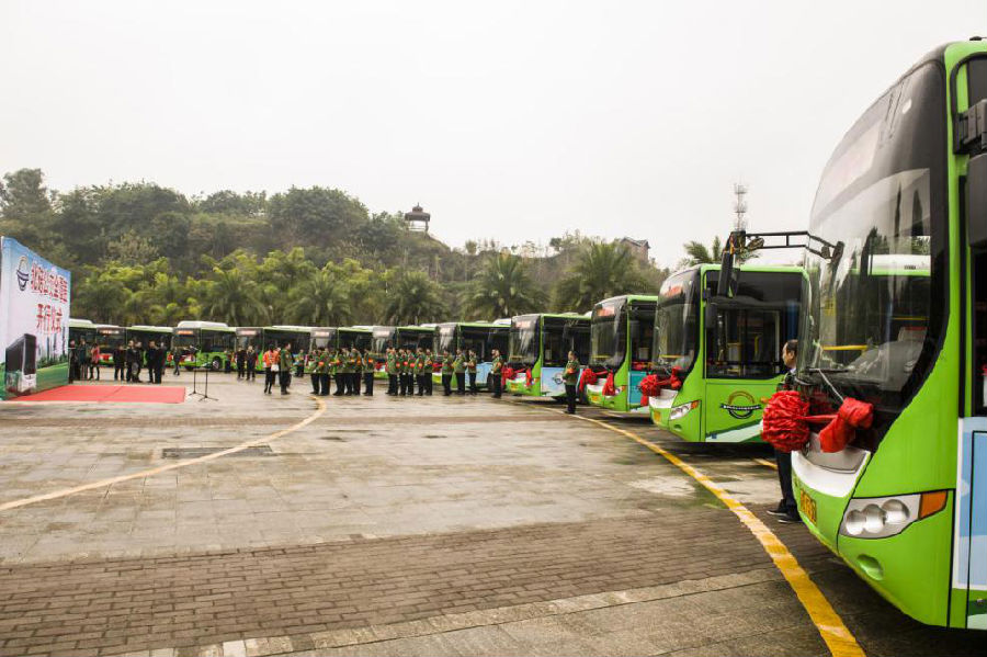 11月30日上午,北碚公交全覆蓋開行儀式在北碚臺農園公交站隆重舉行,40臺佩戴著大紅花的嶄新公交車整齊劃一,整裝待發(fā)。