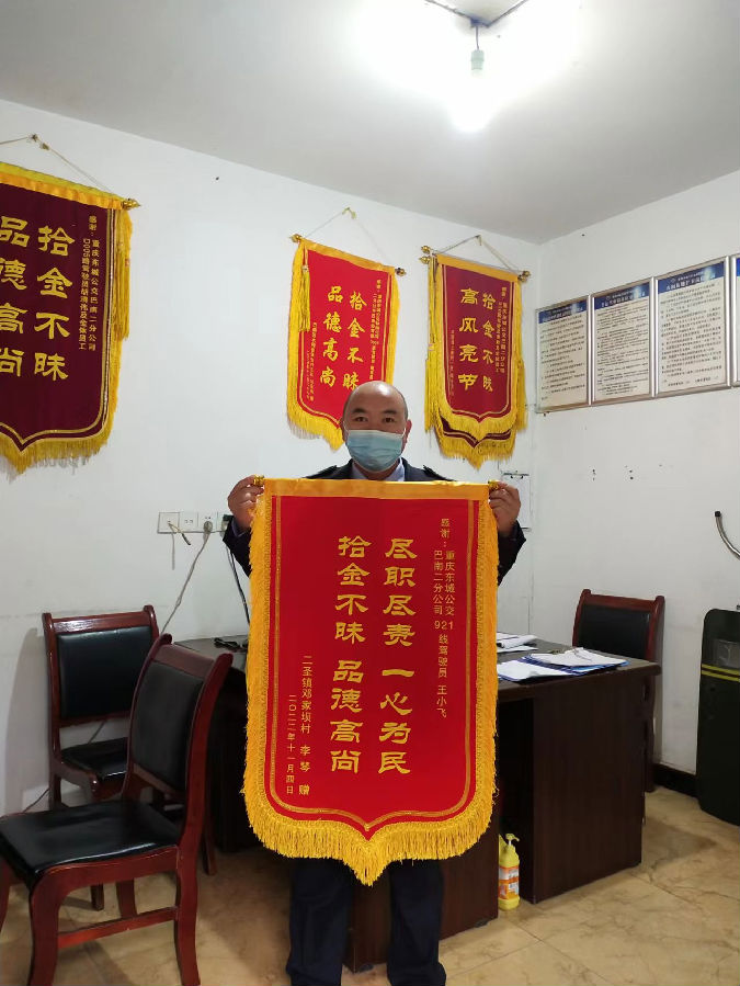 11月4日,木洞公交站場收到一面寫有“盡職盡責(zé),一心為民,拾金不昧,品德高尚”的錦旗,感謝駕駛員王小飛拾金不昧的精神。